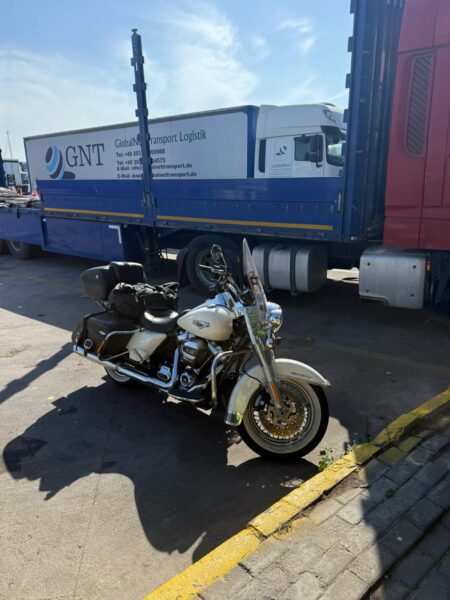 La mia Harley, “La Poderosa“, è finalmente uscita dal porto di Trieste e ora dorme tranquilla in un garage convenzionato con Europ Assistance: la prossima settimana sarà curata dalla Harley Davidson di Bologna.
