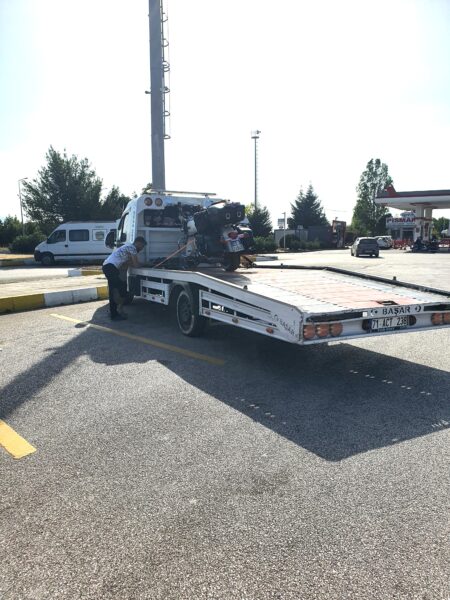 Quando ho chiesto all’autista la ricevuta, mi ha guardato come se lo avessi offeso e mi ha detto, più o meno: “Grossi problemi, no ricevuta, no buono…“. I miei principi civici sono stati accantonati subito e gli ho dato quanto richiesto: qui i crediti inesiglibili li risolvono alla radice: o paghi o il mezzo sta a terra. Mi ha fatto capire che aspettava un suo collega, che è giunto dopo mezz’ora con un altro carro attrezzi. Abbiamo caricato la moto sul camion, sempre una fatica bestiale, poi il primo se ne è andato intascando i soldi ed io sono salito con il secondo, che aveva con sè il figlio di otto anni, Ömer, e volante più pomello cambio perlati: